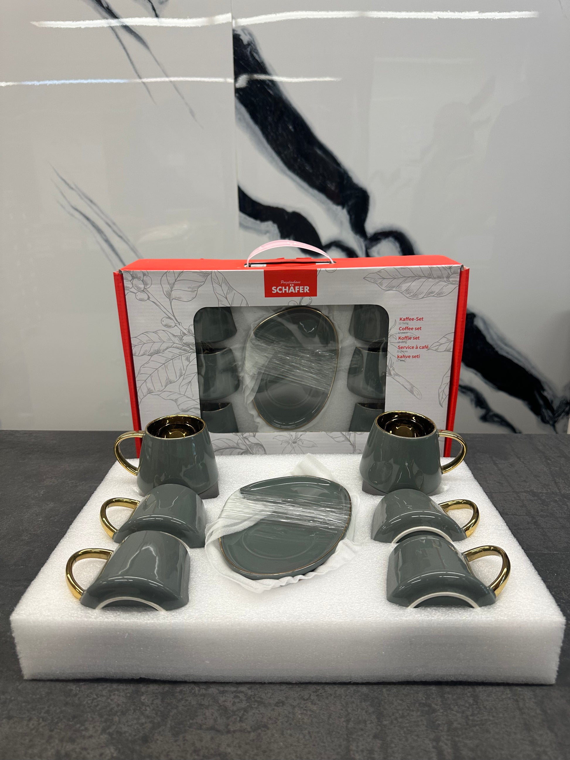 Dieses stilvolle Kaffee Set von Schäfer mit grauem Porzellan und goldenen Akzenten verleiht Ihrer Kaffeestunde eine moderne Eleganz. Das 12-teilige Set kombiniert zeitgemäßes Design mit luxuriösen Details.