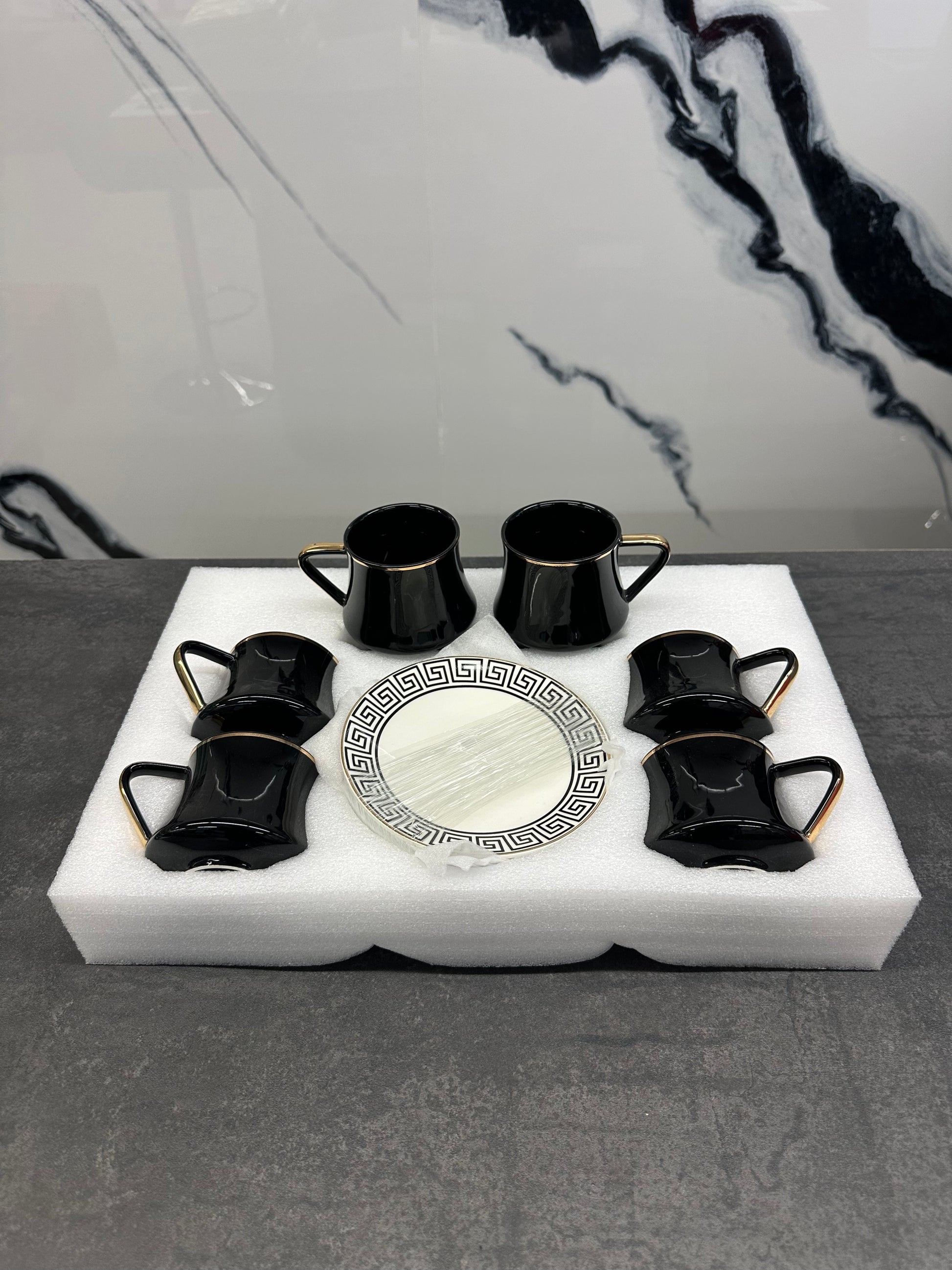 Genießen Sie Kaffee in kunstvollem Luxus - dieses elegante Set mit der raffinierten Schwarz-Gold-Kombination und dekorativem Muster macht jede Kaffeepause zu einem besonderen Erlebnis und ist ein echter Blickfang auf jedem Tisch.