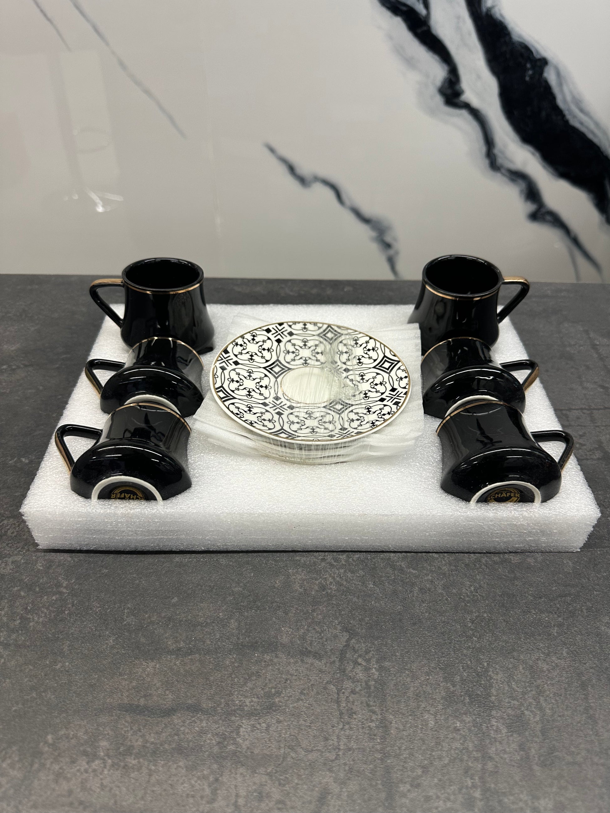 Dieses exquisite Mokka Set von Schäfer mit schwarzem Porzellan, goldenen Akzenten und kunstvollem Muster verleiht Ihrer Espresso-Zeit eine luxuriöse und orientalische Note. Das 12-teilige Set ist perfekt für authentische Mokka-Momente und elegante Kaffeepausen.